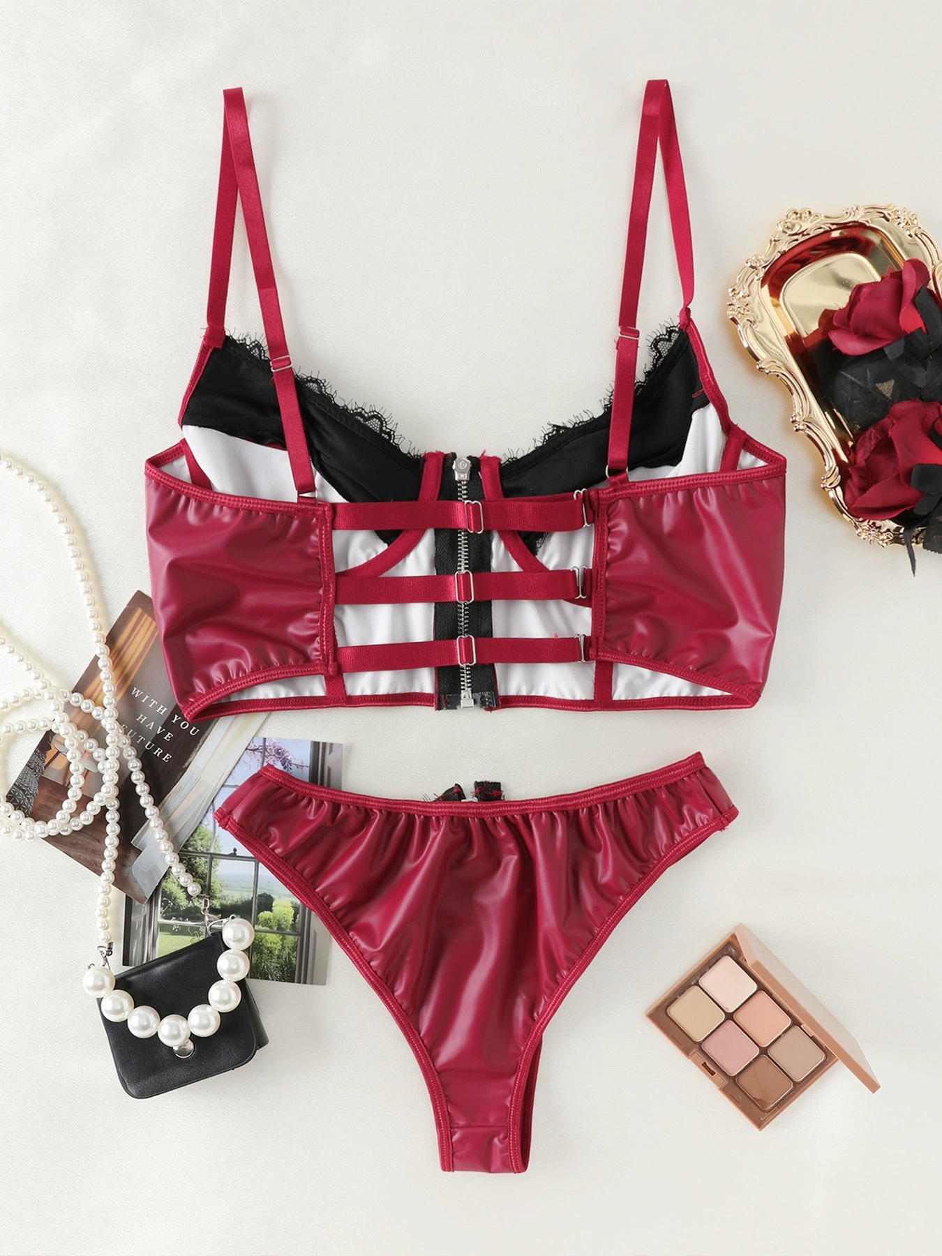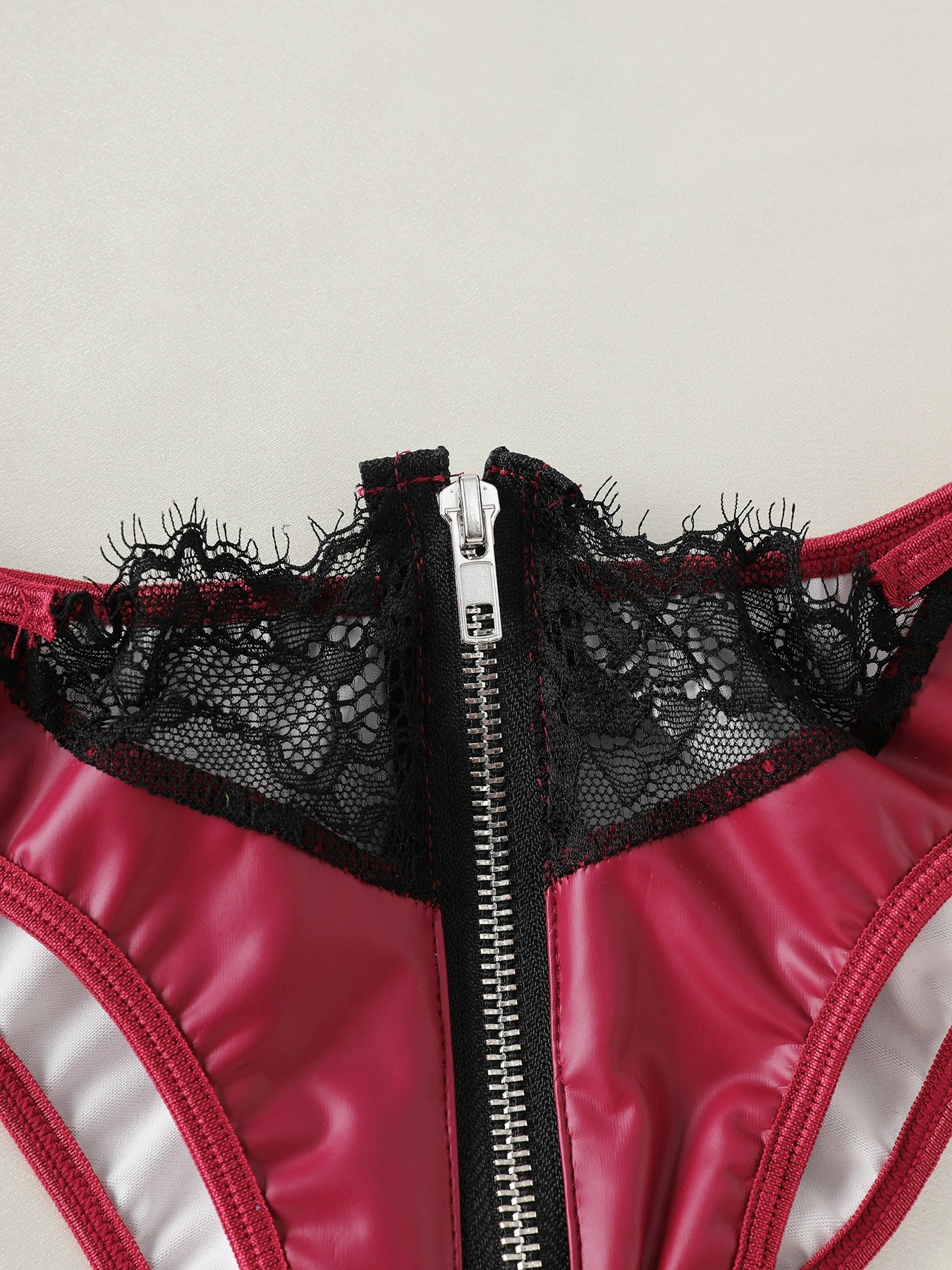 Feminine Lace Eyelash Trim PU Leather Zipper Decorative Intimate Underwear Set