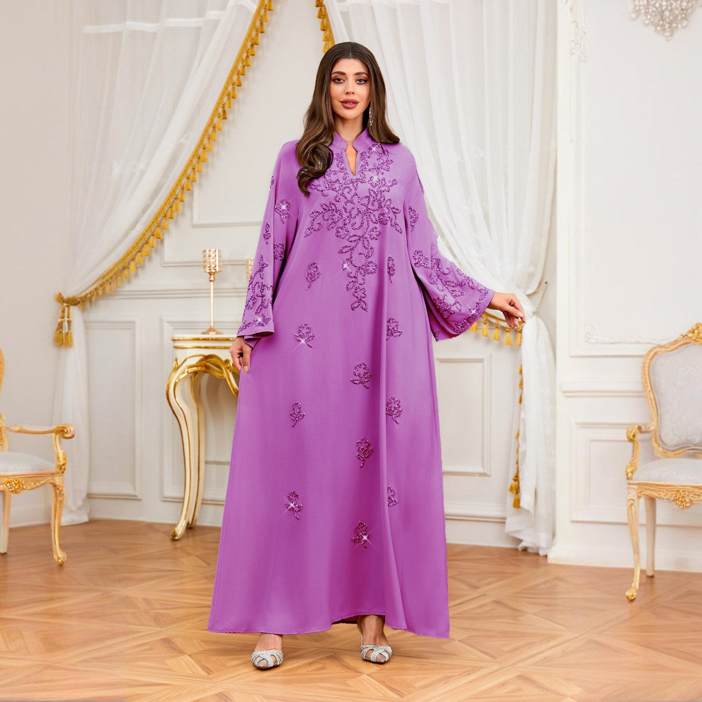 In Stock 2026 New Musilin Cross-Border Middle Eastern Arabian Clothing Women's Hand-Embellished Rhinestone Robe Dress