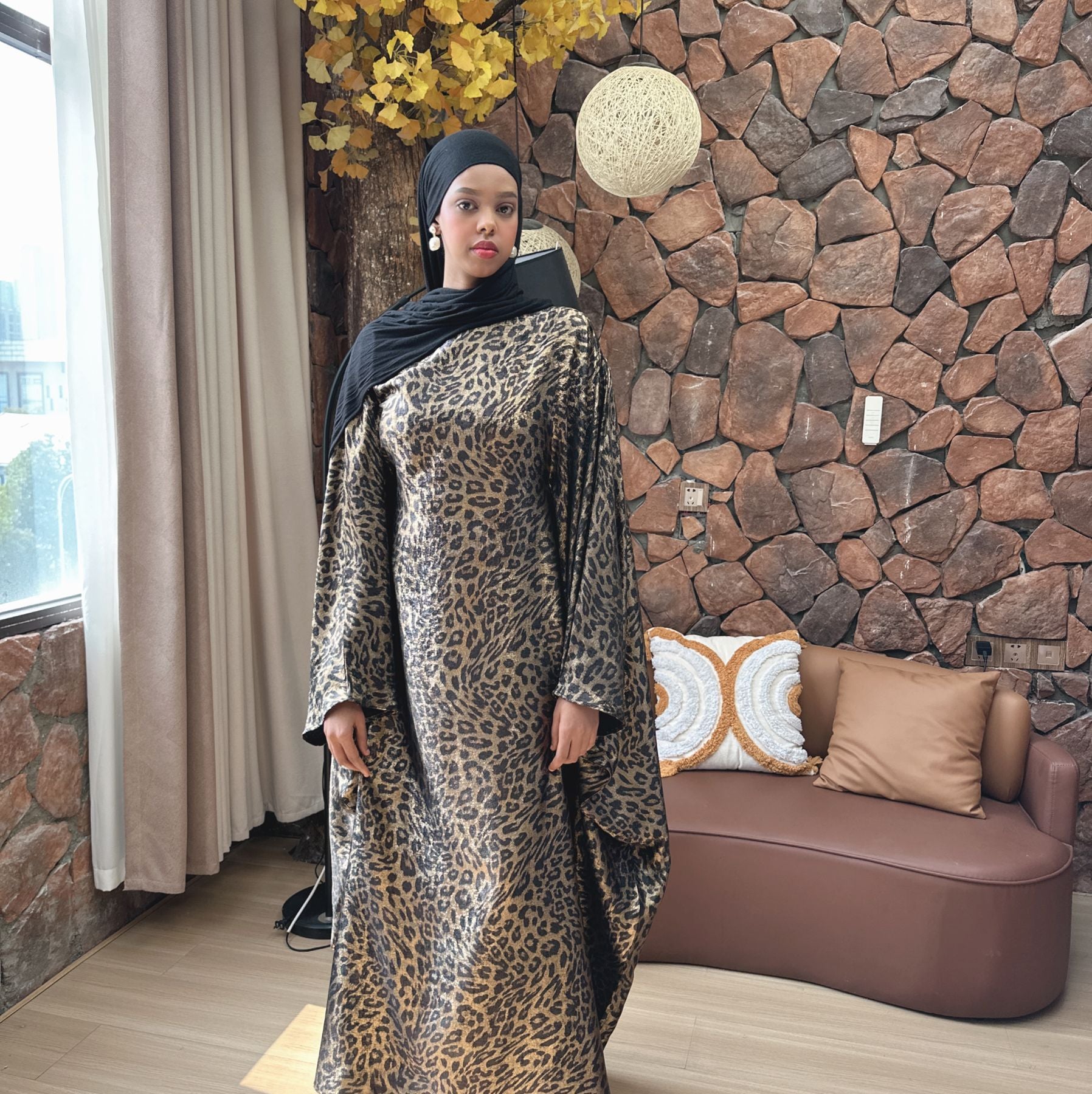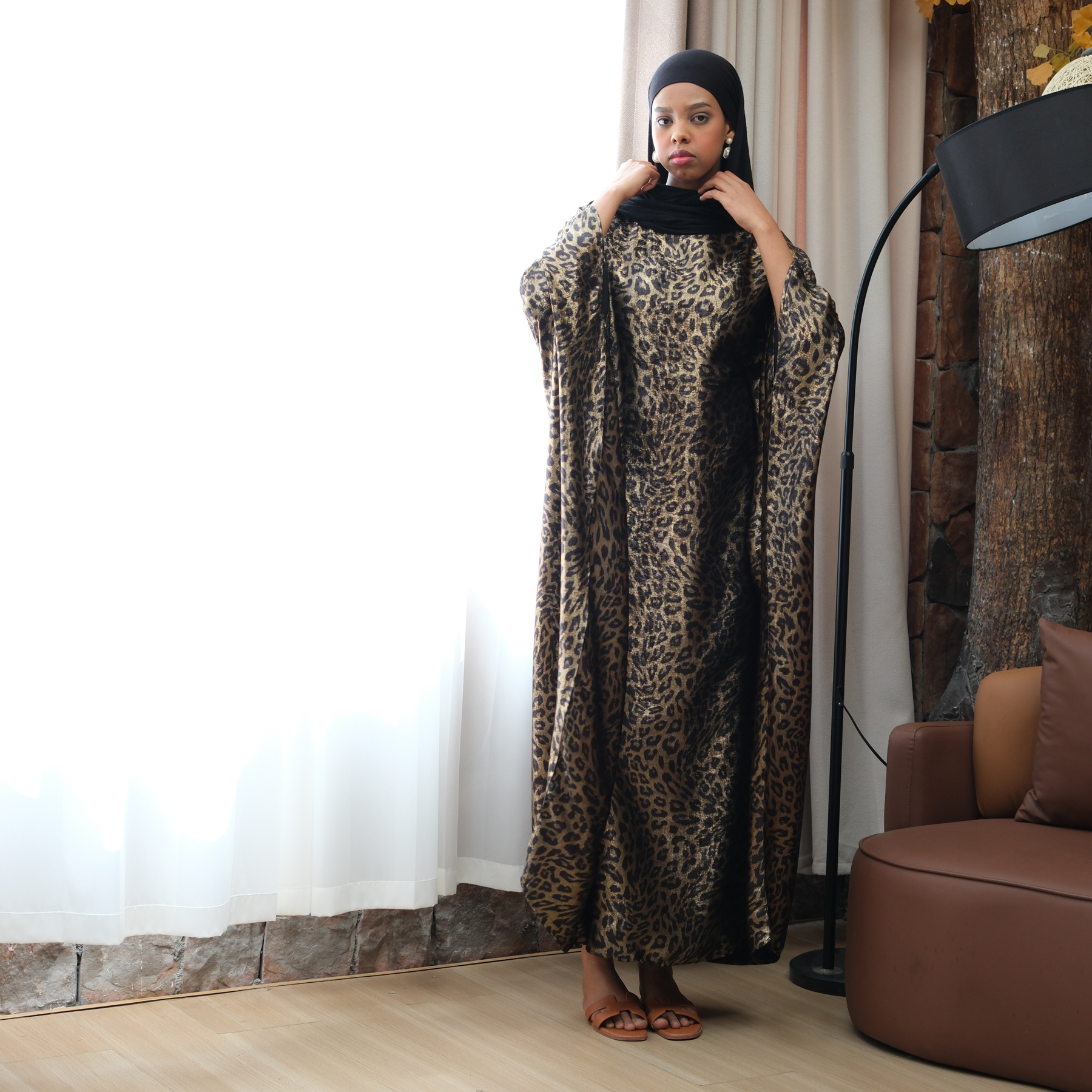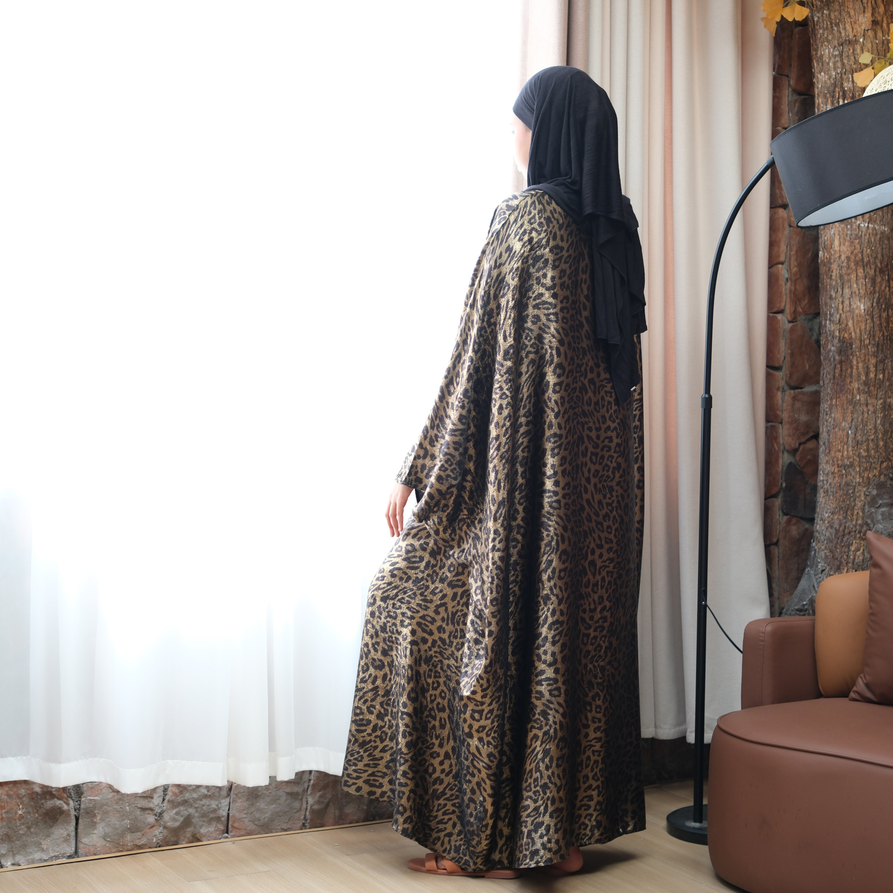 Pure American Print Dress, Batwing Sleeve Leopard Pattern Long Dress