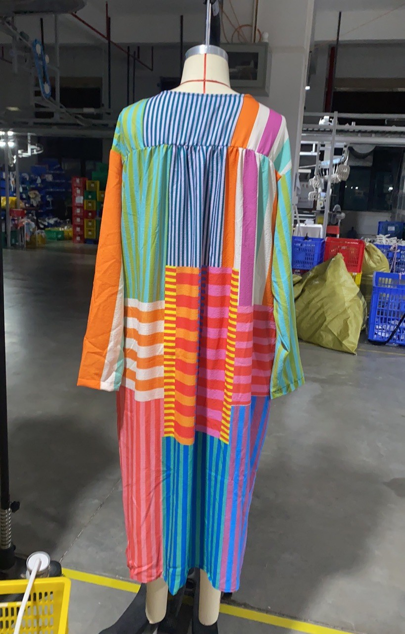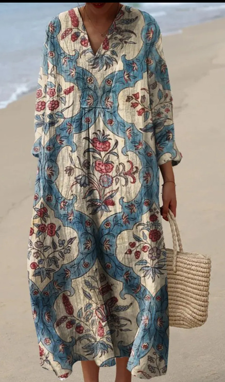 Resort Style Printed Long Sleeve For Women Loose Fitting V Neck Maxi Dress
