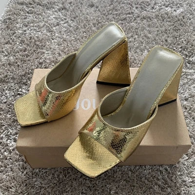 Women's Gold Leather Slipper Shoes Woman High Heels Summer Peep Toe Slippers Women Party Sandal Shoe Dress Slides